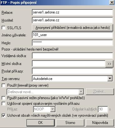 • Relace: Název pro připojení - v našem případě jsme zvolili "server1.axfone.cz"
